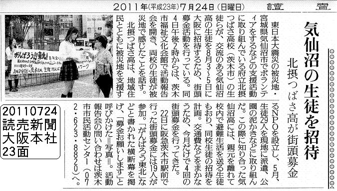 読売新聞(大阪本社)に気仙沼高校生招待の記事が掲載されました。 20110804 ■