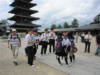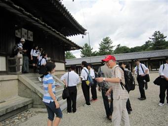 8月5日(3日目):朝の6時30分から送迎リーダーがホスト宅を回って荷物を回収、7時30分までに送迎担当の生徒が迎えに行き、8時にはゲスト、ホスト生徒が北摂つばさ高校に集合しました。生徒どうし名残惜しく、なかなか出発できず、出発したのは9時になりました。奈良に移動、法隆寺を見学し、健康ランドに移動。健康ランドで入浴・夕食などの休息をとった後、20時過ぎに奈良を出発し、気仙沼へ戻りました。