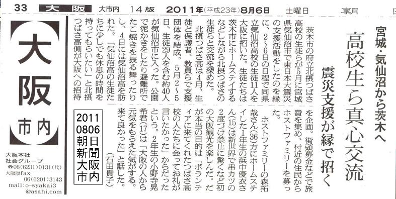 朝日新聞(大阪本社)に気仙沼高校生招待の記事が掲載されました。 20110806 ■
