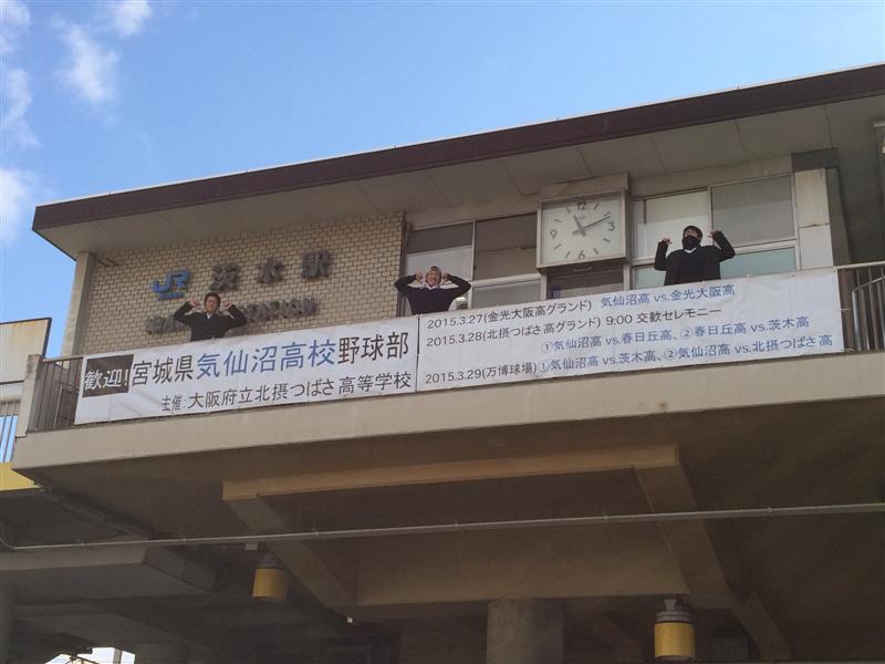JR茨木駅のご厚意により横断幕を設置 2014年12月27日 JR茨木駅の西側の時計の下、手すり部分に、「歓迎 宮城県気仙沼高校野球部 大阪府立北摂つばさ高校」と試合日程を入れた横断幕を設置しました。茨木、春日丘、北摂つばさ、コリア国際という茨木市内4つの高校と高槻市内の金光大阪の計5校で取り組む、復興支援活動ということで、JR茨木駅に協力を快諾していただいた結果であり、まさに「情けは人の為ならず」です。横断幕の設置作業はユネスコクラブのメンバーが担当してくれました。
