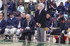 8:00- 少年野球の小学生と高校生の交流のあと 9:00- 歓迎会では茨木市の福岡洋一市長が挨拶、さらに始球式に登板