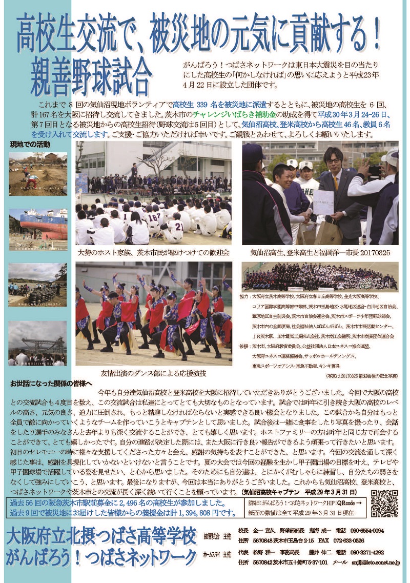 秋雨前線が日本列島に停滞する中、天気アプリとにらめっこうしながら、の阪急茨木市駅前にて、がんばろう!つばさネットワーク主催駅前募金を展開しました。 つばさ高校のユネスコクラブ、国際エリア、夏の気仙沼ボランティア参加者から20171018は13人、20171019は18人が参加しました。 募金していただいた18日の8,835円、19日の16,831円の合計25,666円は全額、3月の気仙沼高校、登米高校の招待に活用されます。 |