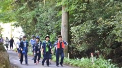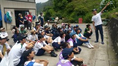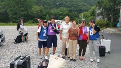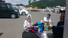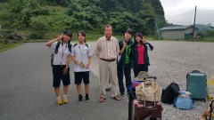 | 熊の取材に来られた新聞記者さん | 山越えのあとフェリーで移動 見送り、見送られの双方でテープの両端をもちます。 | |