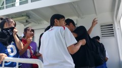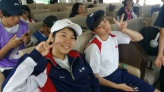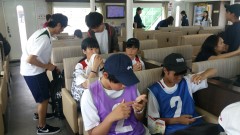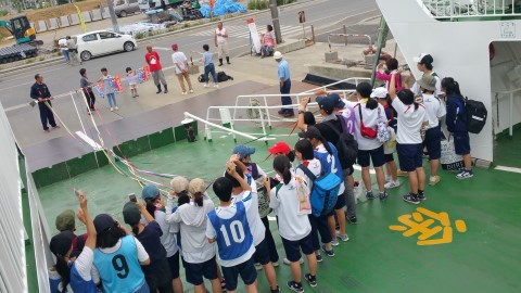 | 気仙沼港 各校の代表挨拶 | 暑さ除けの頬かむり | フェリーの中は快適 |