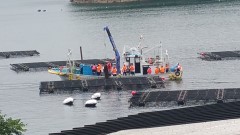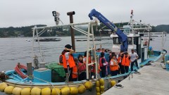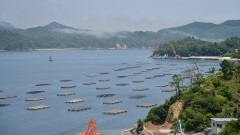 | 見晴らしもすばらしい | カキのいかだの見学 | カキかごの洗浄はつづく |