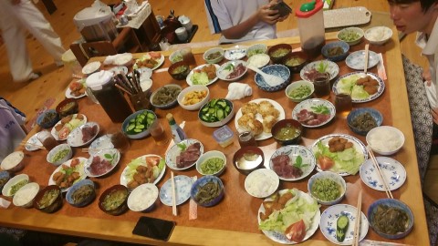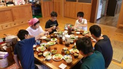 | 民泊先での食事。朝とれた野菜が並びます。 | ||