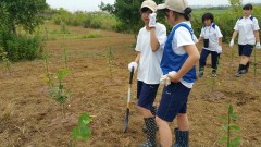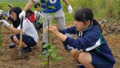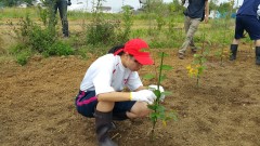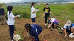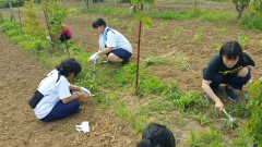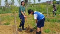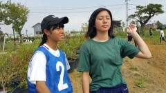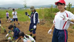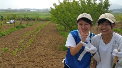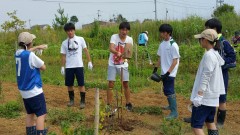 | 添え木にくくりながら苗を植える。 | 日光が当たるように除草も欠かせない。 | 慣れない手つきで試行錯誤。 |