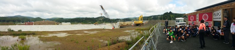 | 12mほど嵩上げされた南三陸町の市場から見える、嵩上げされた堤防と旧防災庁舎の鉄骨の五階部分 20190713 | ||