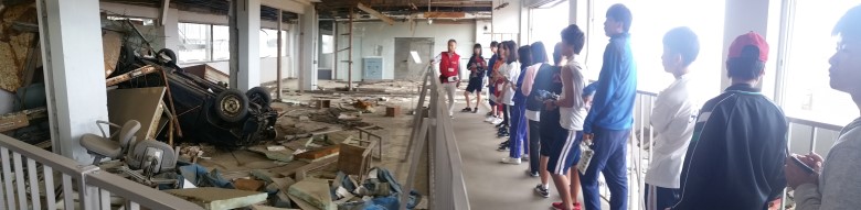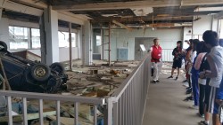 | 当時のままに残された校舎の様子に言葉を失う参加者 20190715 東日本大震災伝承館 | ||