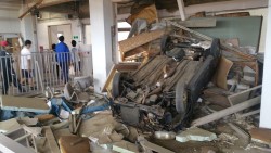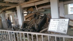 | 東日本大震災伝承館 旧気仙沼向洋高校 | 3階部分に流れてきた自動車の残骸 | 1トン以上ある車が校舎に流れ着いた |